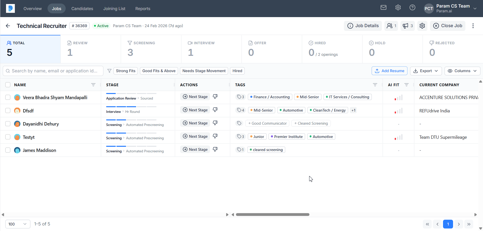 Resumes coming in as applications to the jobs posted on job boards through Param.