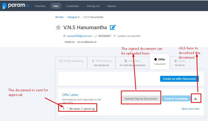 The uploaded document will reflect in the ‘Offer’ Tab on the candidate profile.