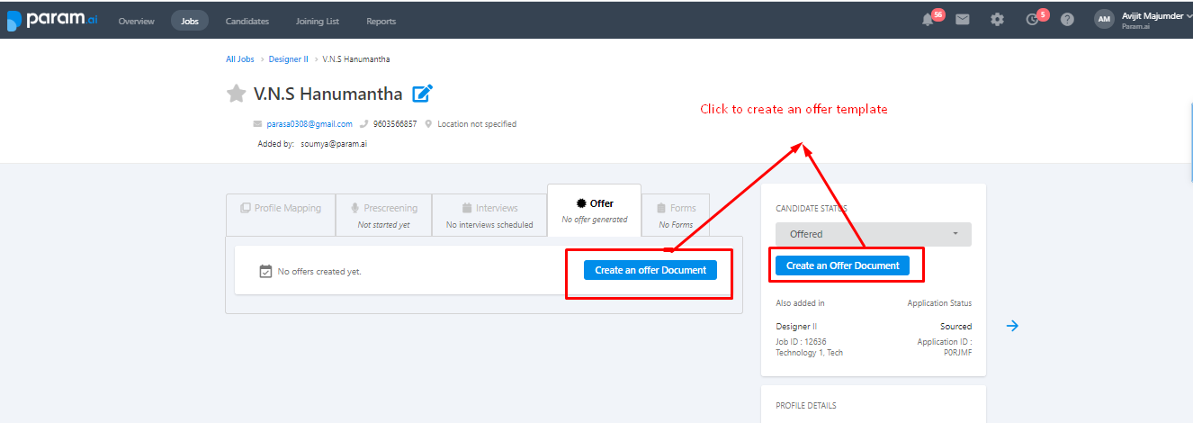 The same option will show up when the recruiter clicks on the offer tab as well as on the candidate’s profile.
