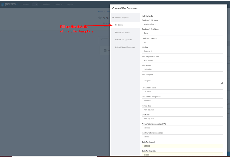 Fill Details: This form allows the user to enter values for the various placeholders defined while adding the template to the platform. The user can also mark placeholders optional on the offer letter templates, thereby generating offer letters with only those fields that are pertinent to the job/candidate.