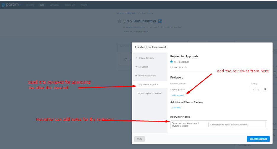 Clicking on the “create an offer document” option will take the recruiter to the offer document creation page where the recruiter will have to choose an offer template, fill in the details of the offer template, preview the template to make sure every detail inserted is correct, send the offer document for approval by a reviewer or skip it.