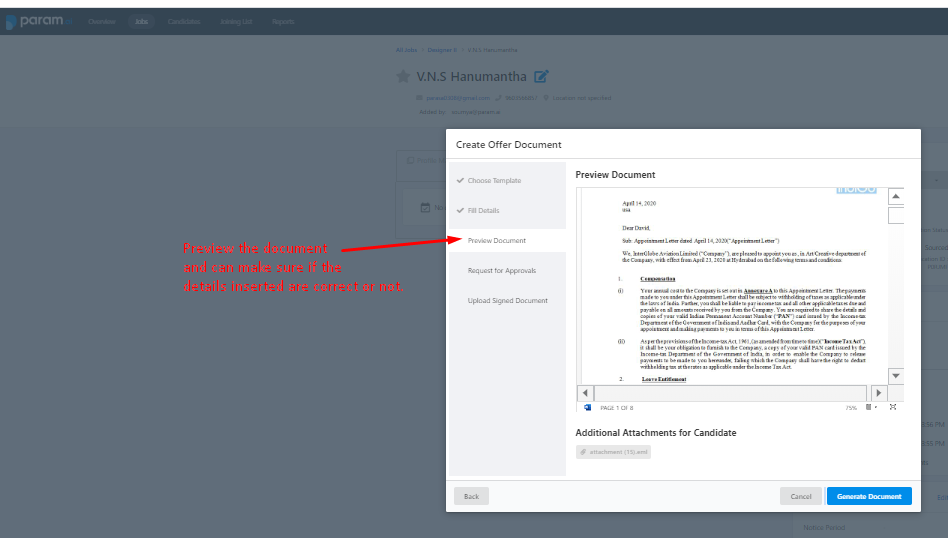 Preview Document: This section shows a preview of the offer document with all the fields filled in. At this stage, the user can go back to the previous page and change any values in the variable fields. However, if the document does not need any changes to be made, the user can choose ‘Generate Document’ at this stage. This takes the user to ‘Request for Approvals’ section. The user can also choose to ‘Download a Copy’ or ‘Print to PDF’